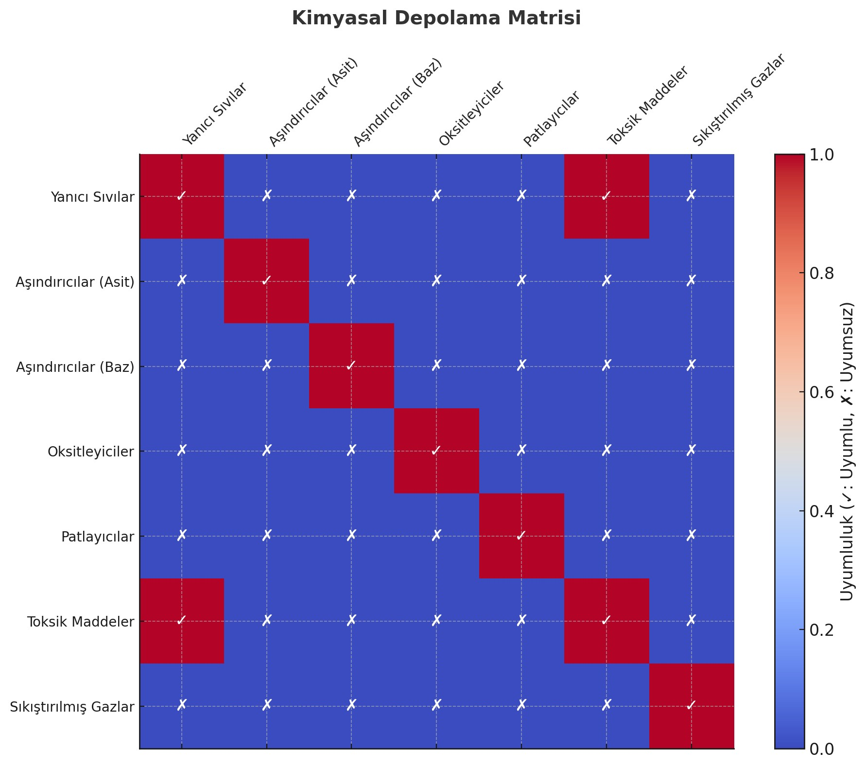 - ✗ İşareti (Uyumsuz): Bu kimyasalların aynı alanda depolanması tehlikelidir. Fiziksel bariyerlerle ayrılmaları veya farklı odalarda depolanmaları gerekir.